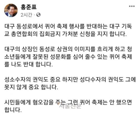 홍 시장은 8일 페이스북을 통해 “대구 동성로 퀴어축제 행사를 반대하는 대구 기독교 총연합회의 집회금지 가처분 신청을 지지한다”고 했다.
