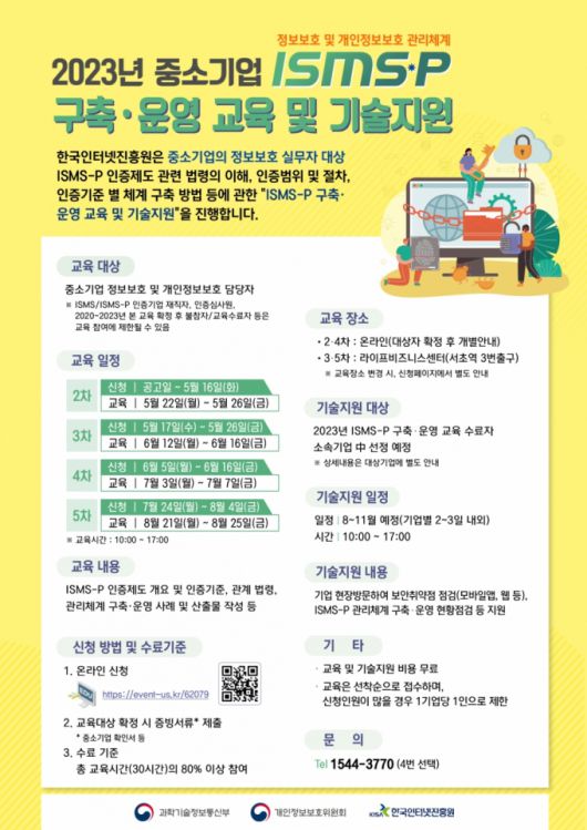 KISA(한국인터넷진흥원)가 과학기술정보통신부와 함께 중소·영세기업을 대상으로 정보보호 활동 지원 사업인 '정보보호 및 개인정보보호 관리체계(ISMS-P)' 구축·운영 교육 및 기술지원을 무료로 실시한다고 8일 밝혔다.