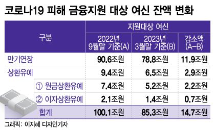 원금상환 유예는 감소분의 36.4%(8000억원)가 상환 완료됐고, 나머지는 대환대출 또는 누적되는 유예 원리금 부담에 상환을 개시한 경우다. 이자상환 유예는 약 2500억원이 상환됐고, 나머지는 더 이상 상환을 유예하지 않기로 했다.