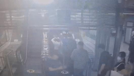 경기소방재난본부에서 제공한 CCTV 영상을 보면 출근 시간대 시민들이 줄지어 탑승하던 상행 에스컬레이터가 갑자기 역주행하기 시작한다.
