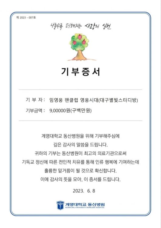 임영웅 팬클럽 영웅시대 대구별빛스터디방에서는 다가오는 임영웅 생일을 맞이해 8일 계명대학교 동산병원을 찾아 취약계층환자 의료비 지원금(소아암 및 저소득층 환자) 900만원을 전달했다.