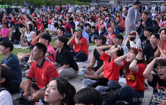 [헤럴드경제=이상섭 기자] 2023 국제축구연맹(FIFA) 20세 이하(U-20) 월드컵 4강전 한국과 이탈리아의 경기가 열린 가운데 9일 오전 서울 광화문 광장에서 시민들이 거리응원을 하고 있다. |