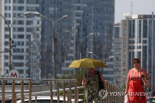 (타스 노보시비르스크=연합뉴스) 지난 5일 러시아 시베리아 도시 노보시비르스크의 기온이 지난 1956년 이후 가장 높은 섭씨 영상 34.3도까지 치솟은 가운데 한 주민이 더위를 피해 양산을 쓰고 있다.