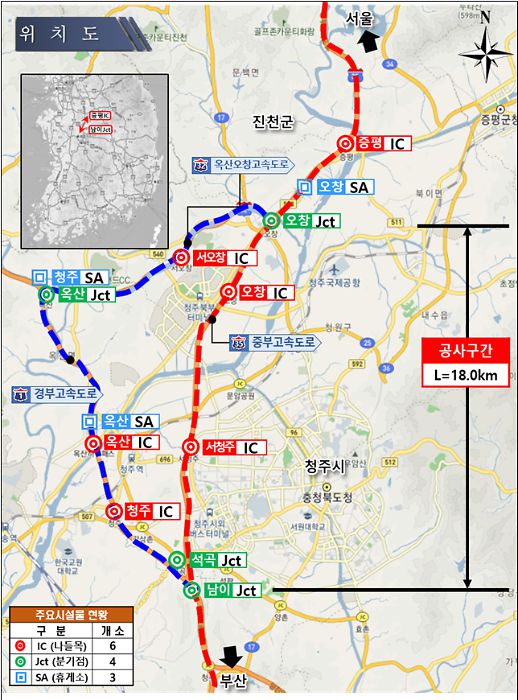 한국도로공사는 오는 12일 오전 9시부터 16일 16시까지 중부고속도로 오창JCT에서 남이JCT(남이방향) 18㎞ 구간 전차로를 주‧야간 전면통제 한다고 9일 밝혔다.