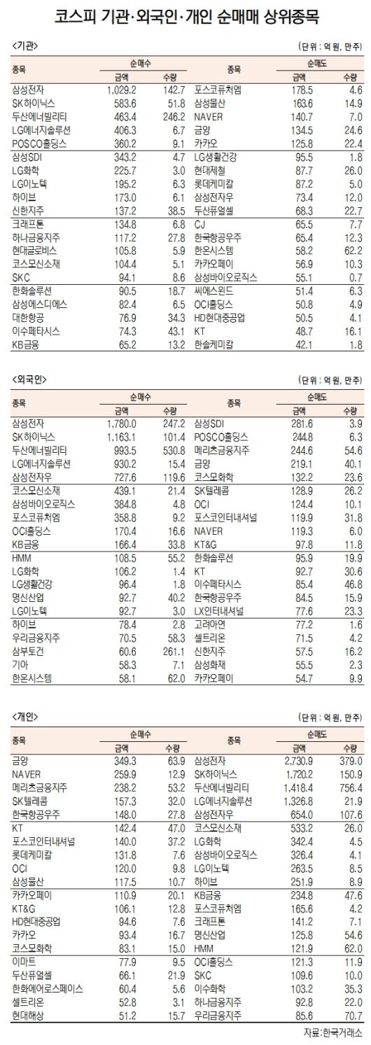기관은 삼성전자(005930)(10298억원)를 비롯해 SK하이닉스(000660)(584억원), 두산에너빌리티(034020)(463억원), LG에너지솔루션(373220)(406억원), POSCO홀딩스(005490)(360억원), 삼성SDI(006400)(343억원), LG화학(051910)(226억원), LG이노텍(011070)(195억원), 하이브(352820)(173억원), 신한지주(055550)(137억원), 크래프톤(259960)(135억원), 하나금융지주(086790)(117억원), 현대글로비스(086280)(106억원) 등을 순매수했다. 순매도 상위 종목은 포스코퓨처엠(003670)(179억원)와 삼성물산(164억원), NAVER(141억원), 금양(135억원), 카카오(126억원), LG생활건강(051900)(96억원), 현대제철(88억원), 롯데케미칼(87억원), 삼성전자우(005935)(73억원), 두산퓨얼셀(68억원), CJ(66억원), 한국항공우주(65억원), 한온시스템(58억원) 등을 매도했다.