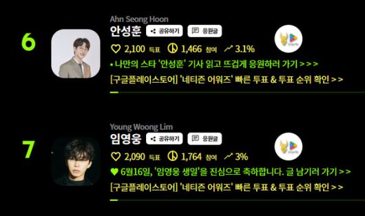 9일 오후 16시 36분 기준 안성훈은 2100표, 임영웅은 2090표를 각각 득표한 상태다. 특히 네티즌 어워즈 인기스타라고 할 수 있는 임영웅을 넘었다는 것은 팬들의 투표열기가 한몫했다고 할 수 있다.