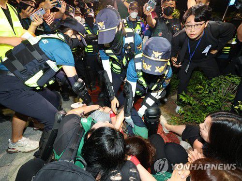 (서울=연합뉴스) 김도훈 기자 = 경찰이 9일 오후 서울 서초구 대법원 인근 인도에서 열린 비정규직 노동단체 '비정규직 이제그만 공동투쟁'의 1박 2일 문화제 참가자들을 강제 해산하고 있다. 2023.6.9 superdoo82@yna.co.kr ▶제보는 카카오톡 okjebo▶연합뉴스 앱 지금 바로 다운받기~▶네이버 연합뉴스 채널 구독하기 <저작권자(c)연합뉴스. 무단전재-재배포금지.>