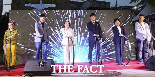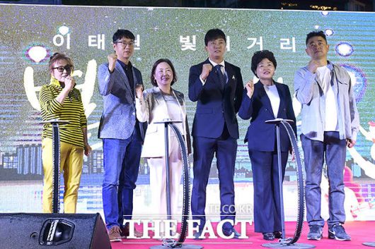 [더팩트ㅣ서예원 인턴기자] 김선수 용산구 부구청장(왼쪽에서 세번째)과 한순자 이태원 일동 주민자치위원회 부위원장, 조성호 서울시 관광정책과장, 유태혁 이태원 관광특구연합회 부회장, 이미재 용산구의회 운영위원장, 김한구 이태원 엔틱 가구 협회장(왼쪽부터)이 9일 오후 서울 용산구 녹사평역광장에서 열린 이태원 상권 활성화를 위한 '별헤는 밤' 점등식 퍼포먼스에 참석하고 있다.