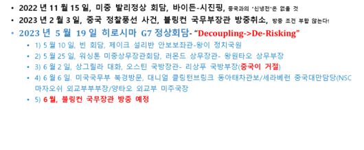 세계의 패권국 미국은 정부가 나서서 탈중국(decoupling)하라고 기업에 독려하고 동맹들을 다그치고 난리 치더니 히로시마 G7이후 스탠스를 바꾸어 동맹들을 당혹스럽게 하고 있다. 중국과의 경제관계를 탈동조화(decoupling)가 아닌 위험감소(de-risking)로 재정의했다.