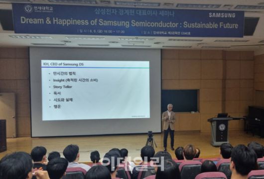 경계현 삼성전자 DS부문장 사장이 9일 오후 서울 연세대에서 ‘삼성전자 대표이사 세미나’를 진행했다. (사진=독자 제공) |