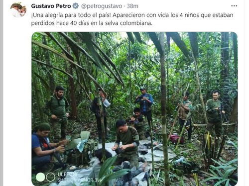 구스타보 페트로 대통령은 자신의 트위터에 "40일 전 콜롬비아 정글에서 실종됐던 아이들이 살아있는 것으로 보인다"며 다소 유보적인 표현을 하면서도 "온 나라의 기쁨"이라고 썼다.