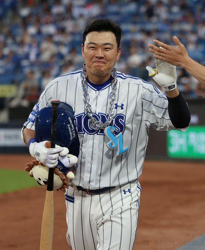 (서울=연합뉴스) 10일 대구삼성라이온즈파크에서 열린 2023 프로야구 KBO리그 롯데 자이언츠와 삼성 라이온즈의 경기에서 5회말과 6회말 연타석 홈런을 친 삼성 오재일이 동료선수들과 하이파이브를 하고 있다. 2023.6.10 [삼성 라이온즈 제공. 재판매 및 DB 금지]