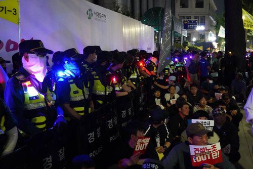 (서울=연합뉴스) 10일 오후 서울 서대문구 경찰청 앞에서 민주노총 건설노조 조합원들이 노조원의 생존권 보장을 요구하는 집회를 하고 있다. 2023.6.10 [민주노총 건설노조 제공. 재판매 및 DB 금지] photo@yna.co.kr ▶제보는 카카오톡 okjebo▶연합뉴스 앱 지금 바로 다운받기~▶네이버 연합뉴스 채널 구독하기 <저작권자(c)연합뉴스. 무단전재-재배포금지.>