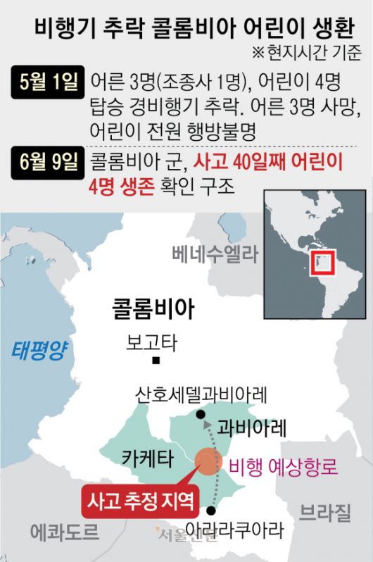지난달 1일 모두 7명을 태우고 소도시 산호세델과비아레로 가던 세스나 206편이 콜롬비아 남부 정글인 솔라노 마을로 추락했다. 아이들의 엄마와 친척, 조종사 등 성인 탑승자 3명은 사고 15일째 숨진 채 발견됐다. 동승했던 아이들의 행방은 알 수 없었다.