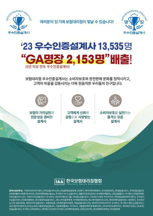 한국보험대리점협회는 올해 법인보험대리점(GA) 소속 설계사를 대상으로 장기 근속 및 준법 영업 여부 등을 주요 선정기준으로 운영한 결과, 우수인증설계사 1만3535명을 최종 선정했다고 12일 밝혔다.