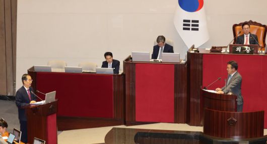 한덕수 국무총리가 12일 국회 본회의 대정부 질문에서 민주당 윤호중 의원의 질문에 답변하고 있다. 사진=연합 지면화상 |