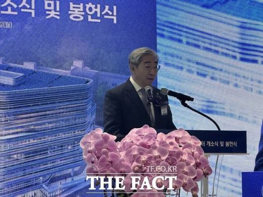 윤동섭 연세의료원장이 12일 열린 연세의료원 중입자치료센터 개소식에서 인사말을 하고 있다. /문수연 기자 |