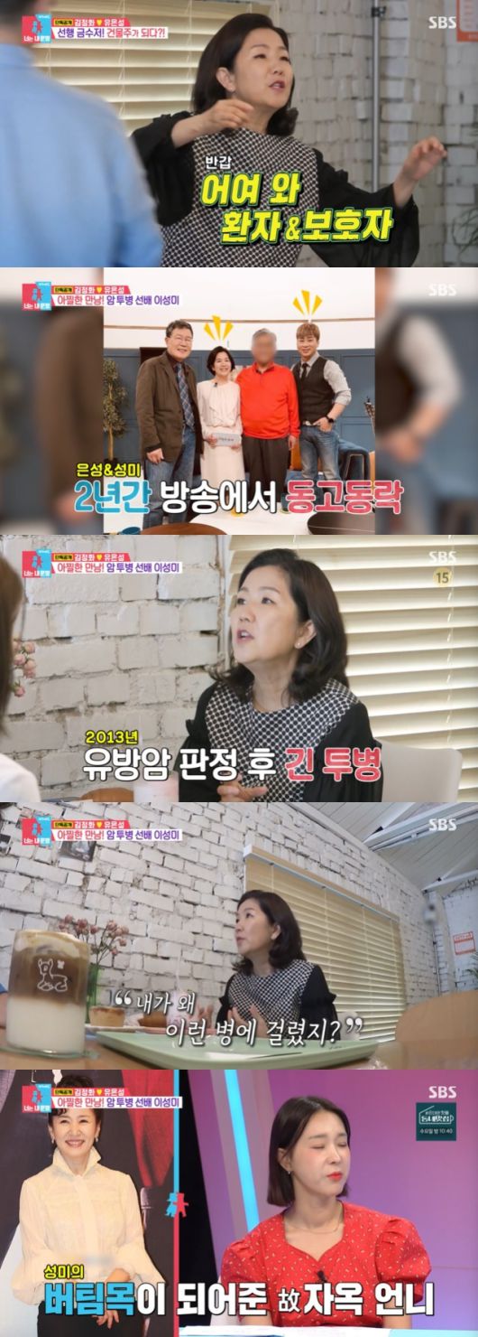 이성미는 "(암에 걸리면) 가족도 위로가 안되고 '내가 왜 이런 병에 걸렸지? 뭐가 문제지? 내가 뭘 잘못했지? 앞으로 어떻게 해야 하지?' 생각이 든다. 가슴이 철렁 내려앉더라"라고 해 안타까움을 자아냈다.