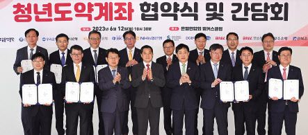 청년도약계좌 협약식 및 간담회가 12일 서울 중구 명동 은행회관에서 열린 가운데 참석자들이 기념촬영을 하고 있다. 청년도약계좌는 연봉 7500만원 이하 중 가구소득이 중위 180% 이하, 만 19~34세 청년을 대상으로 공급하는 상품으로 오는 15일 출시된다. 임세준 기자 |