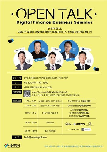 금융·경제 인플루언서인 삼프로TV 김동환 대표의 진행으로 STO 관련 전문 변호사와 루센트 블록, 투게더아트, 그리너리 등 대표 기업들이 참여해 이야기를 나눈다. 서울시 유튜브에서도 생중계된다.