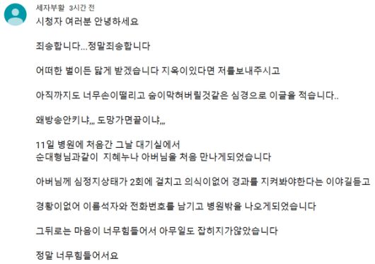 이어 "그 뒤로 마음이 힘들어서 아무 일도 잡히지가 않았다"며 "그러던중 12일부터 지혜누나 어머님과 연락이 닿게 됐다"고 설명했다.