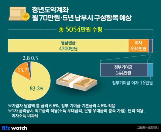청년도약계좌 월 납입 한도는 70만원, 만기는 5년이다. 계좌에 가입한 청년이 5년 동안 5000만원을 만들기 위해선 매달 70만원씩 납부한다해도 적용되는 금리가 6%는 돼야 한다.