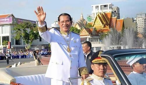 캄보디아 시민들에게 손을 흔들고 있는 훈센 총리 |