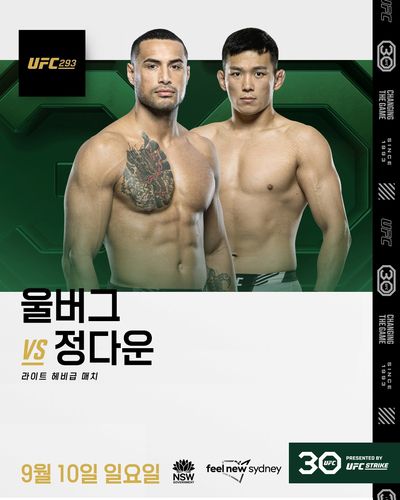 정다운은 9월 10일(한국시간) 호주 시드니 올림픽파크에서 열릴 UFC 293에서 카를로스 울버그(32)와 라이트헤비급 맞대결을 펼친다.