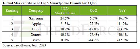 중국 업체들도 고전을 면치 못했다. 오포의 올 1분기 생산량은 2680만대로 전분기대비 17% 줄었고 샤오미도 27.4% 줄어든 2650만대를 생산하는데 그쳤다. 전 세계적인 소비자 신뢰도 하락, 완제품 재고 과잉으로 생산계획을 조정한 영향으로 풀이된다. 비보도 전분기대비 14.2% 줄어든 2000만대를 기록했다.