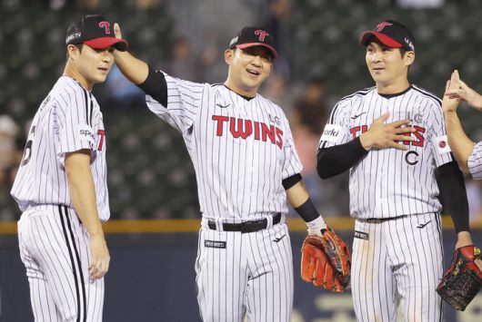 LG 백승현(왼쪽)이 14일 잠실 삼성전에서 세이브를 올린 후 동료들과 기뻐하고 있다. 서울 | 연합뉴스 |