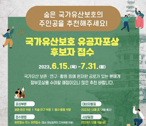 [이데일리 이윤정 기자] 문화재청은 6월 15일부터 7월 31일까지 ‘2023년도 국가유산보호 유공자 포상’ 후보자 추천서를 접수한다. 국가유산의 보존·연구·활용 분야에 뛰어난 공적을 세운 개인과 단체를 찾아 포상하기 위해 마련했다.