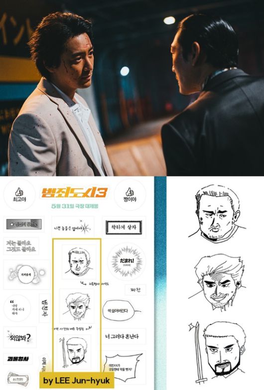 이 그림은 이준혁이 직접 그린 것으로, 각 캐릭터의 특징을 섬세하게 묘사해 표현한 이준혁의 빼어난 그림 실력에 감탄이 이어지고 있다. 이 스티커는 '범죄도시3' 무대인사 등을 통해 관객들에게 전해지며 영화를 보는 또 다른 즐거움을 주고 있는 중이다.