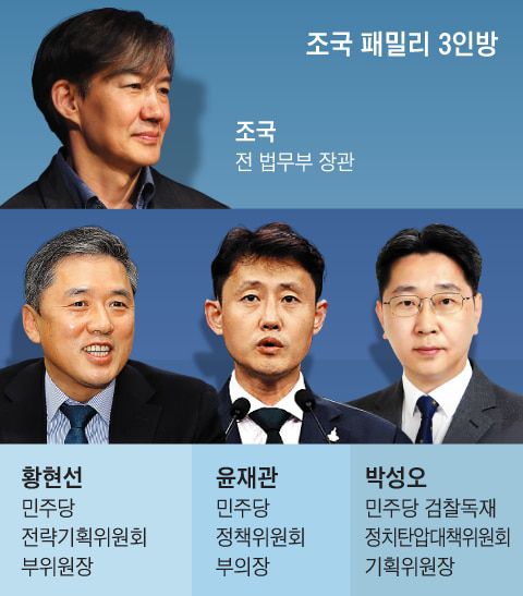 조 전 장관 출마 이야기와 함께 조 전 장관 측근들도 내년 총선을 준비하고 있다. 조 전 장관이 청와대 민정수석 재직 당시 민정수석실에서 함께 일했던 황현선·윤재관·박성오 전 선임행정관으로, 당내에서 ‘조국 패밀리 3인방’으로 통한다. 조 전 장관의 보좌관을 했던 황현선 민주당 전략기획위원회 부위원장은 김성주 의원 지역구(전북 전주병), 윤재관 정책위 부의장은 이소영 의원 지역구(경기 의왕과천), 박성오 검찰독재정치탄압대책위 기획위원장은 전혜숙 의원 지역구(서울 광진갑) 등 주로 비명계 의원 지역구를 노리고 있다.