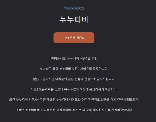 누누티비 시즌2 측은 홈페이지를 통해 "심사숙고 끝에 누누티비 시즌2 사이트를 종료한다"고 19일 밝혔다. 운영진은 "시즌3 오픈 계획은 없으며 유사 사칭 사이트에 유의하시기 바란다"며 "또한 누누티비 시즌2는 기존 폐쇄된 누누티비 사이트와 어떠한 관계도 없음을 다시 한번 알려드린다"고 덧붙였다.