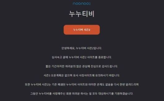 누누티비 시즌2 측은 사이트에 “심사숙고 끝에 누누티비 시즌2 사이트를 종료한다”고 19일 밝혔다.