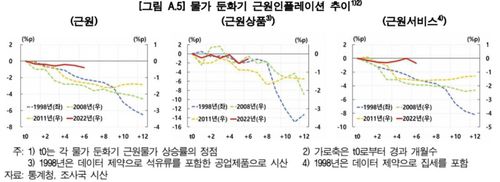 보고서는 "최근 근원물가 오름세의 경직적 흐름은 양호한 서비스소비 및 노동시장 등이 그 배경으로 작용하고 있다"면서 "서비스소비는 2021년 하반기에 팬데믹 이전 수준을 회복한 뒤 최근까지 증가세를 이어가고 있고 취업자 수도 1998년이나 2008년 물가 둔화기와 달리 증가 흐름을 보이고 있다"고 밝혔다.