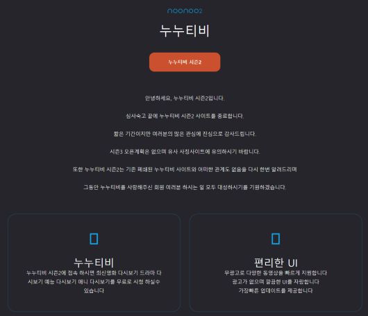 누누티비 시즌2는 홈페이지를 통해 “시즌3 오픈계획은 없으며 유사 사칭사이트에 유의하시기 바란다”며 “누누티비 시즌2는 기존 폐쇄된 누누티비 사이트와 어떠한 관계도 없음을 다시 한 번 알려드린다”고 적었다. 현재는 누누티비 시즌2를 통해 어떠한 콘텐츠도 이용할 수 없는 상황이다.