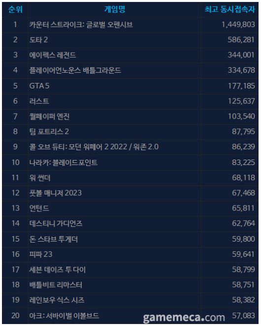 ▲ 6월 20일 오후 12시 기준 일 최고 동시접속자 TOP20 (자료출처: 스팀)