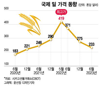 시카고선물거래소(CBOT) 기준 국제 밀 가격은 2020년 6월 1톤당 188달러에서 2년만인 지난해 5월 419달러로 2.2배 올랐다. 하지만 이달 기준 233달러로 고점 대비 44.4% 하락했다.