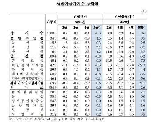 5월 생산자물가지수는 1년 전인 2022년 5월(119.43)과 비교하면 0.6% 상승했다.