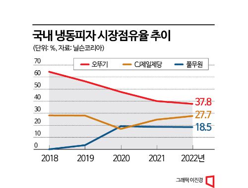 다만 경쟁업체들의 추격도 매섭다. CJ제일제당은 2020년 12월 ‘고메 프리미엄 피자’를 출시하고 1년간 300만판 이상 팔아치우며 선두 추격에 열을 올리고 있다. 지난해 기준 냉동피자 매출은 약 300억원으로 전년 대비 약 17% 증가했다. 후발주자인 풀무원도 이달 ‘치즈폭포 시카고피자 볼로네제’를 선보이는 등 지속적으로 신제품을 출시하며 점유율을 끌어올리고 있다.