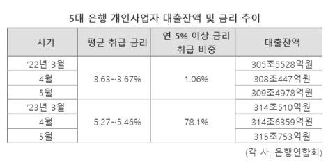 21일 은행연합회에 따르면 5대 은행(KB국민·신한·우리·하나·NH농협)이 지난 3개월(3~5월) 취급한 개인사업자 물적담보대출 평균금리는 연 5.27~5.46%로 집계됐다. 전년 같은 기간(3.63~3.67%) 대비 하단은 1.64%p, 상단은 1.79%p 높아진 수치다. 이에 지난 3개월간 취급한 전체 개인사업자 물적담보대출의 78.1%는 연 5% 이상의 금리가 적용됐다. 지난해 3~5월 개인사업자 물적담보대출 중 연 5% 이상 고금리 대출의 비중은 단 1.06%에 불과했다.