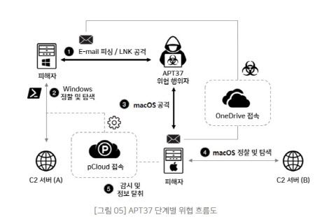 APT37은 맥 OS를 사용하는 특정 공격 대상을 현혹시키기 위해 다양한 장치를 뒀다. 공격은 정보 탈취를 위한 1차 공격, 악성코드를 심기 위한 2차 공격으로 이뤄졌다.