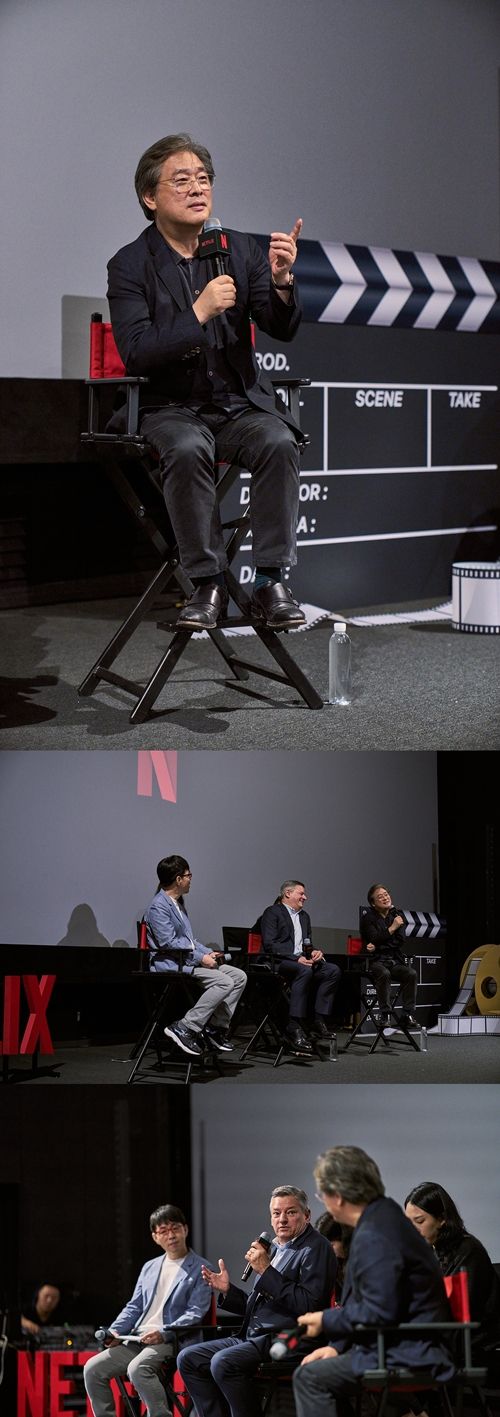 21일 용산 CGV 박찬욱 관에서 엔터테인먼트 스트리밍 서비스 넷플릭스(Netflix)의 테드 서랜도스(Ted Sarandos) 공동 최고 경영자(CEO)와 한국 영화계를 대표하는 박찬욱 감독이 한국 영화의 내일을 이끌어갈 영화학도들을 만났다.