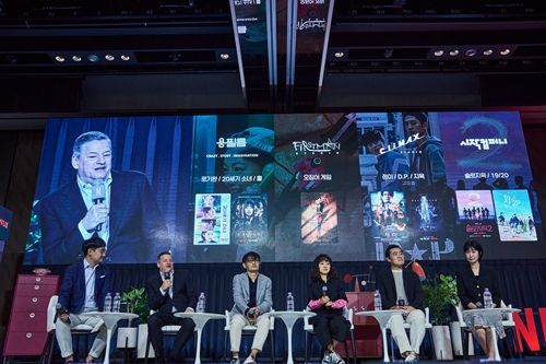최고 경영 책임자 테드 서랜도스, 한국 콘텐츠 총괄VP 강동한, 용필름 대표 임승용, 퍼스트맨스튜디오 대표 김지연, 클라이맥스 스튜디오 대표 변승민, 시작컴퍼니 대표 김수아가 ‘넷플릭스와 한국 콘텐츠 이야기 간담회’에 참석했다. 사진=넷플릭스 |