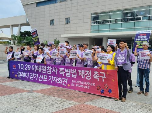 (광주=연합뉴스) 천정인 기자 = 10·29 이태원 참사 유가족협의회와 시민단체는 22일 광주시의회 앞에서 기자회견을 열고 '진상규명 특별법 제정을 위한 릴레이 행진'을 예고했다.