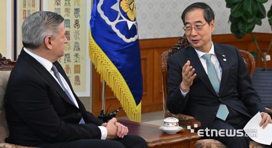 한덕수 국무총리(오른쪽)가 22일 서울 종로구 정부서울청사에서 방한한 테드 서랜도스 넷플릭스 공동 최고경영자와 만나 환담을 나누고 있다. 이동근 기자 foto@etnews.com [Copyright © 전자신문. 무단전재-재배포금지]