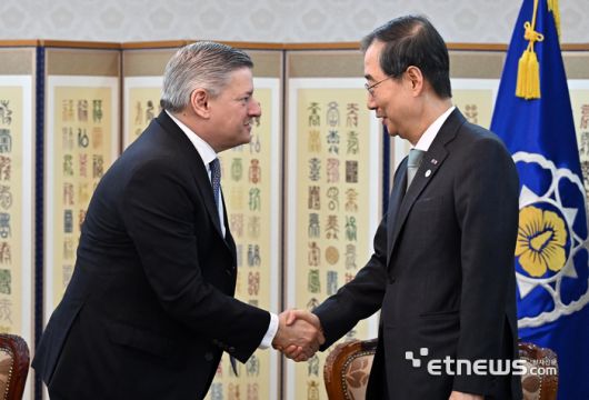 한덕수 국무총리(오른쪽)가 22일 서울 종로구 정부서울청사에서 방한한 테드 서랜도스 넷플릭스 공동 최고경영자와 만나 악수하고 있다.