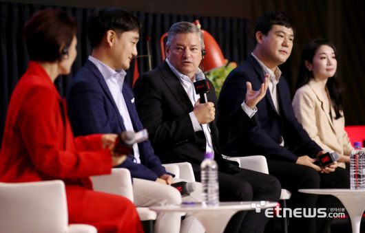 글로벌 동영상 온라인 서비스업체(OTT) 넷플릭스가 22일 오전 서울 종로구 포시즌스 호텔에서 ‘넷플릭스와 한국 콘텐츠 이야기’를 주제로 간담회를 가졌다. 테드 서랜도스 넷플릭스 공동 최고 경영책임자(CEO)가 ‘넷플릭스와 한국 콘텐츠 이야기’ 대담을 마친 뒤 기자들의 질문에 대답을 하고 있다. 왼쪽 두 번째부터 강동환 부사장, 서랜도스 CEO, 이성규 시니어 디렉터, 고현주 PR총괄 시니어 디렉터.