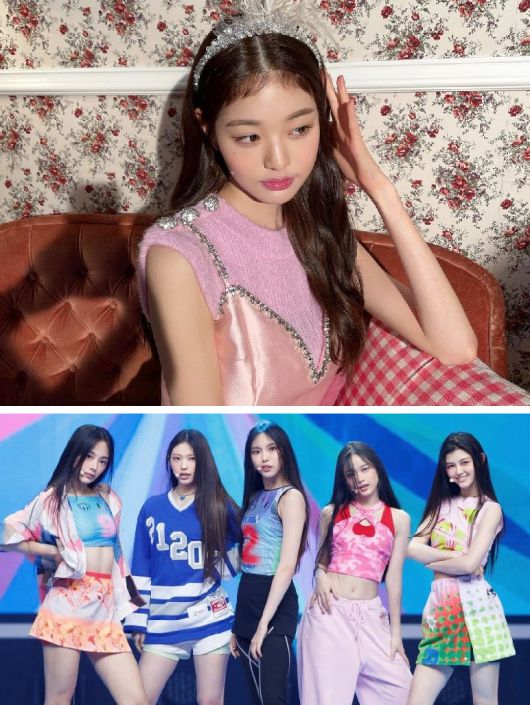 분홍색 원피스와 민소매 니트로 바비코어 패션을 연출한 아이브 멤버 장원영(위 첫 번째 사진). 스포츠 유니폼과 스트라이프 양말 등 블록코어 의상을 입고 가요 프로그램 무대에 선 뉴진스. 사진 출처 그룹 공식 SNS·Mnet 화면 캡처 |